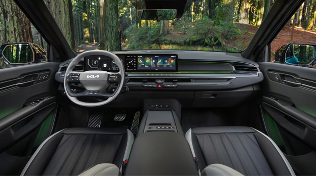 Technology is one of the EV9’s strongest selling points. The interior features a dual 12.3-inch digital display setup that merges the instrument cluster with the infotainment system for a sleek, futuristic look. Kia’s latest interface includes over-the-air software updates, ensuring drivers always have the latest features without visiting a dealership.